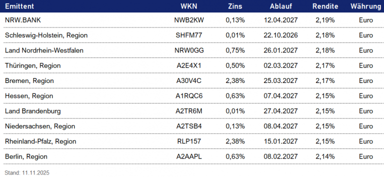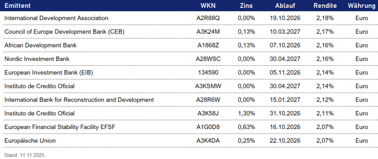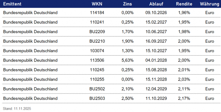(*) Die dargestellten Anleihen und ihre Rangfolge basieren auf einer tagesaktuellen Auswertung der Renditen am Tag der Veröffentlichung. Die Auswahl dient ausschließlich der Information über Marktsegmente und Zinsniveaus zum Erstellungszeitpunkt. Die Darstellung stellt keine Anlageempfehlung, Kauf- oder Verkaufsempfehlung dar. Vergangene oder tagesaktuelle Renditen sind kein verlässlicher Indikator für die zukünftige Wertentwicklung. Es wird keine Gewähr für die Richtigkeit, Vollständigkeit oder Aktualität der dargestellten Inhalte übernommen.