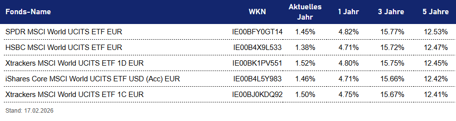 (*) Die dargestellten Informationen stellen keine Anlageempfehlung, Finanzanalyse oder Aufforderung zum Kauf oder Verkauf von Finanzinstrumenten dar. Die Rangfolgen beruhen ausschließlich auf Auswertungen historischer Daten. Eine Vergangenheitsperformance ist kein verlässlicher Indikator für die zukünftige Wertentwicklung. Es wird keine Gewähr für die Richtigkeit, Vollständigkeit oder Aktualität der dargestellten Inhalte übernommen.